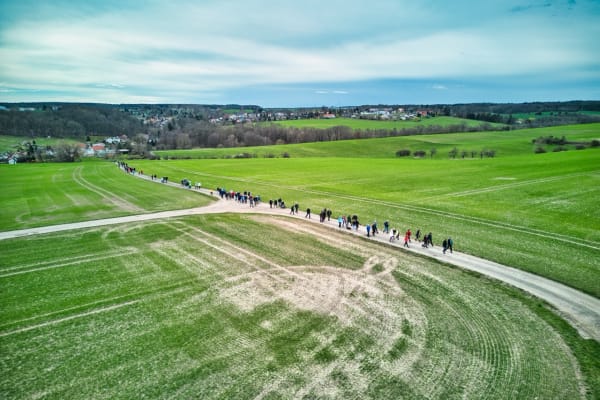 Dann setzte sich der Wanderzug in Richtung Kleinbernsdorf in Bewegung. Bei einer kurzen Zwischenzählung wurden 101 wandernde Teilnehmer gezählt. Über Feldwege ging es in Richtung Lindenkreuz, bevor in das Wintertal abgebogen wurde, kurz entlang des Wintertalbaches. Anschließend ging es nach Schöna weiter.
