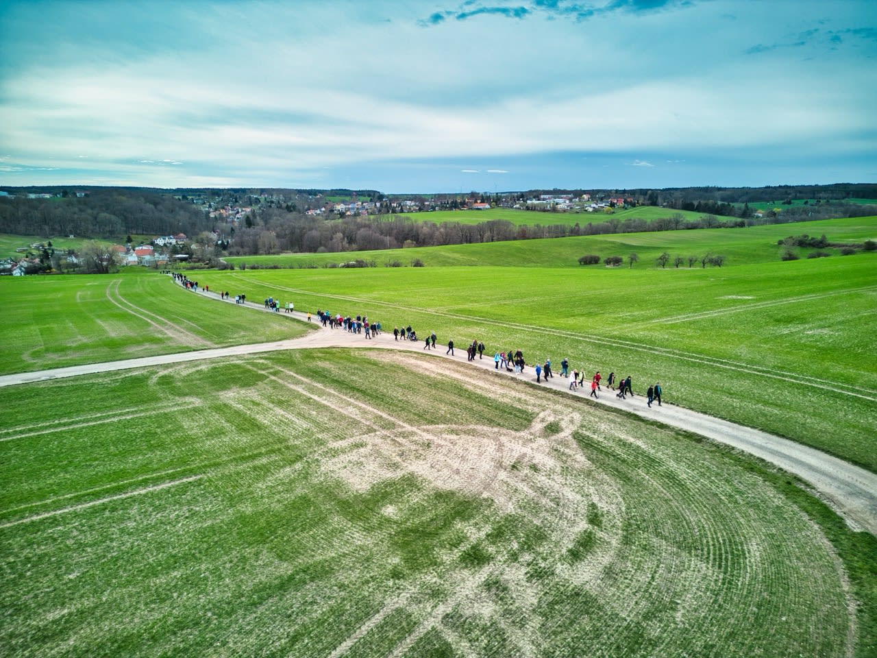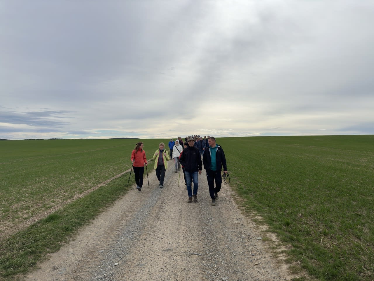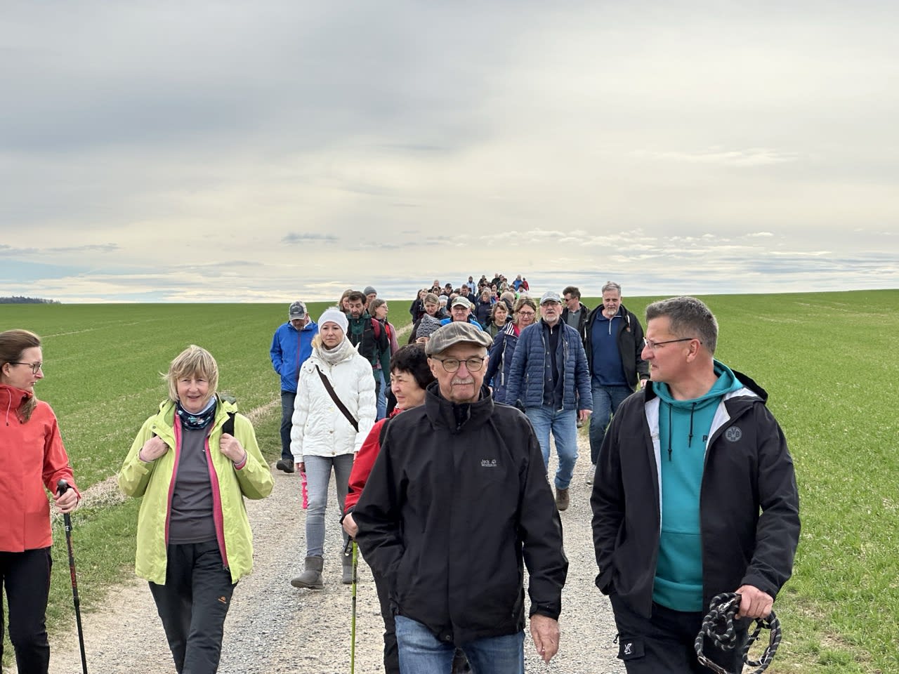 Dann setzte sich der Wanderzug in Richtung Kleinbernsdorf in Bewegung. Bei einer kurzen Zwischenzählung wurden 101 wandernde Teilnehmer gezählt. Über Feldwege ging es in Richtung Lindenkreuz, bevor in das Wintertal abgebogen wurde, kurz entlang des Wintertalbaches. Anschließend ging es nach Schöna weiter.